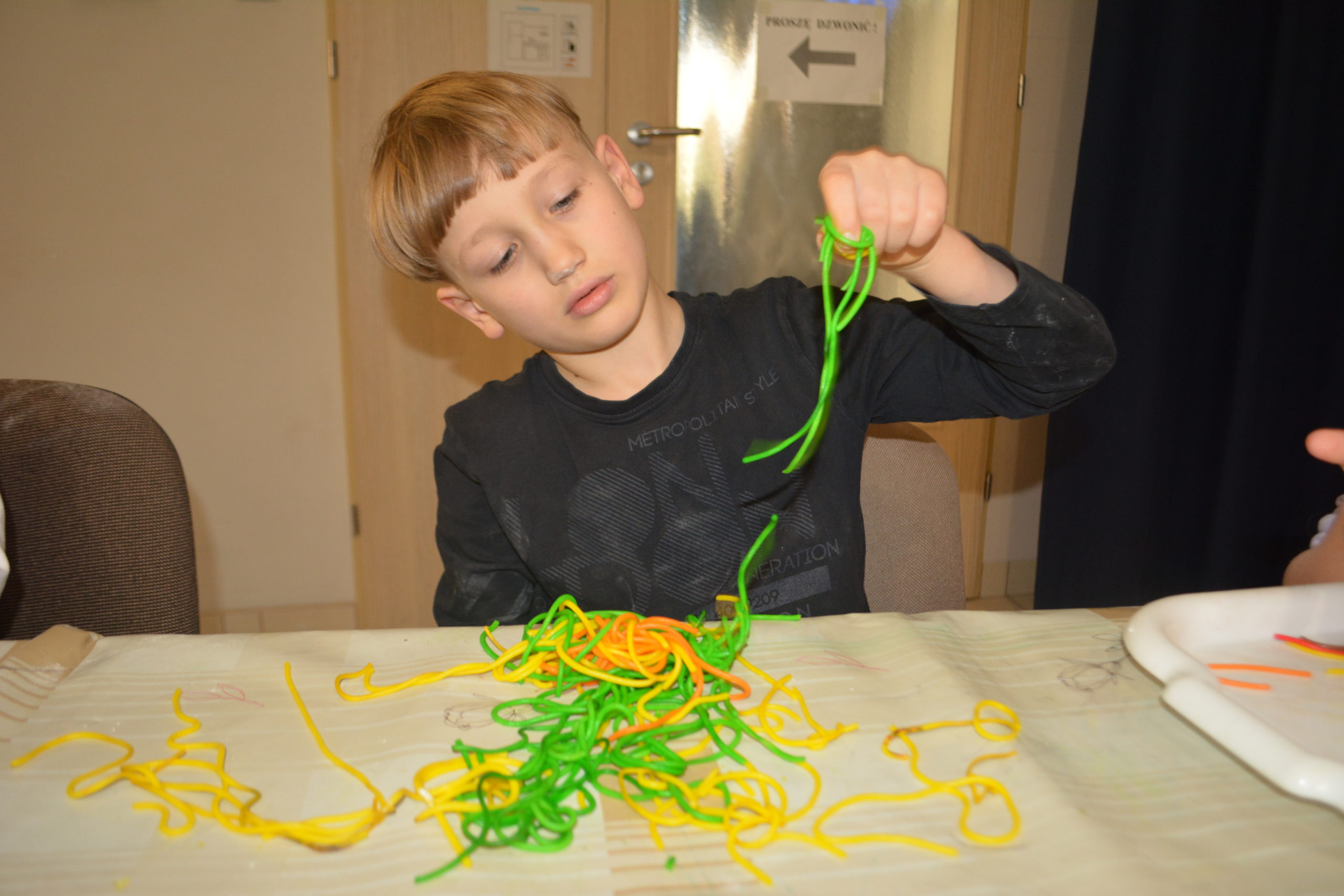 7 listopada uczniowie i wychowankowie DOREW brali udział w warsztatach z okazji DNIA MAKARONU. Na początku zajęć obejrzeliśmy prezentację, z której dowiedzieliśmy się skąd pochodzi makaron, jakie są rodzaje makaronów oraz jakie smaczne potrawy można przygotować z makaronu. Następnie odgadywaliśmy rodzaje makaronów z wykorzystaniem plansz, szukaliśmy darów jesieni w makaronie, mieliśmy okazję dotykać i zobaczyć makaron surowy i ugotowany. Na koniec spotkania powstały piękne makaronowe dzieła sztuki. Celem zajęć z okazji Dnia Makaronu, było zapoznanie dzieci z różnymi kształtami i kolorami makaronu, omówienie historii makaronu oraz jego kulturowego znaczenia, zwłaszcza we włoskiej kuchni. Wychowankowie mieli okazję dowiedzieć się jak można wykorzystać makaron w różnych potrawach, od zup po zapiekanki, a także poznać jego wartości odżywcze. Zajęcia makaronowe były również okazją do rozwijania precyzji, koordynacji wzrokowo-ruchowej i motoryki małej. Podczas zajęć stymulowaliśmy zmysł dotyku poprzez kontakt z różnymi strukturami makaronu oraz wzroku dzięki obserwacji kolorów i kształtów. Prace plastyczne, które powstały podczas warsztatów, pozwoliły nam rozwijać nasze zdolności twórcze, wzmacniać współpracę w grupie i co najważniejsze wyrażać siebie poprzez artystyczną ekspresję a przy okazji super się bawić.