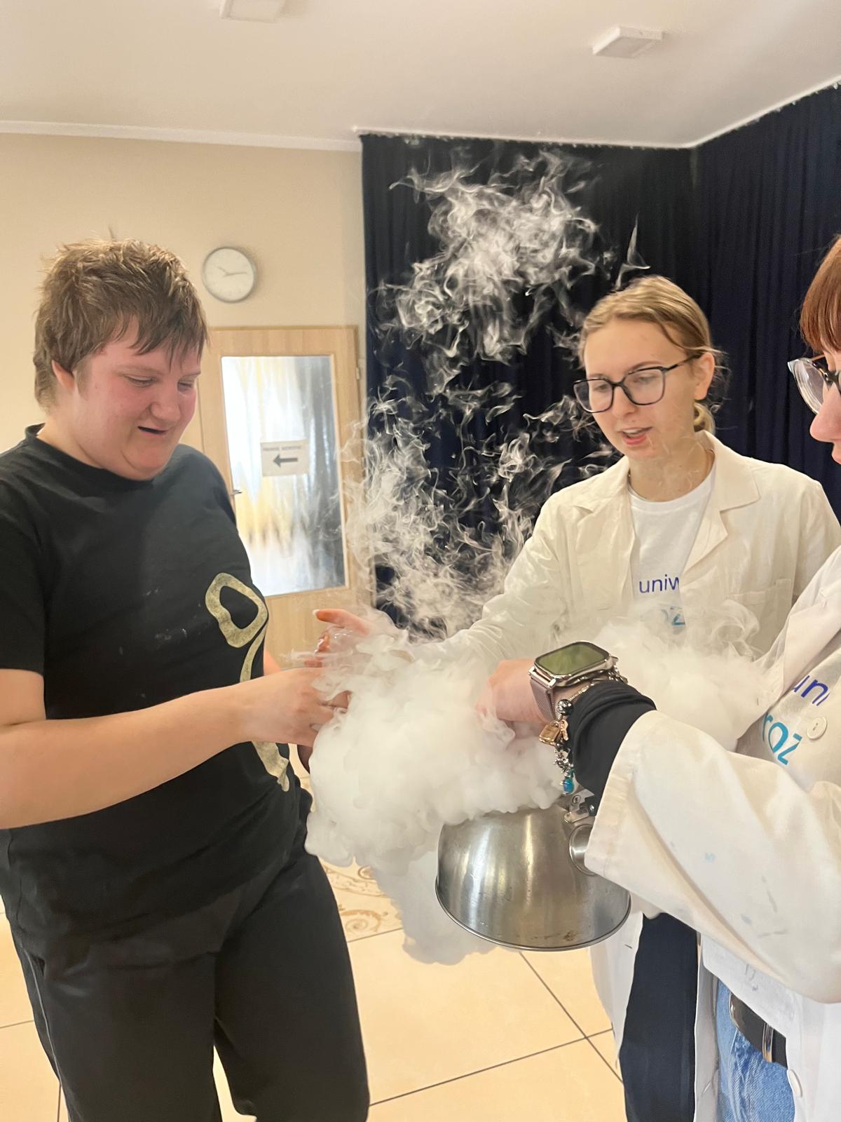 19 lutego w ramach czasu feryjnego uczniowie i wychowankowie DOREW oraz uczestnicy Świetlicy Terapeutycznej poznawali eksperymenty z suchym lodem, które prowadzili profesjonaliści z Uniwersytetu Rozwoju z Katowic. Wielozmysłowo poznawali otaczającą ich rzeczywistość i doświadczali świat w zabawowy sposób: budzili potwora, obserwowali zmieniające się kolory ognia, poznawali ciecz, która pod wpływem suchego lodu zmieniała kolor, widzieli start rakiety. Zajęcia dostarczyły im dużo pozytywnych wrażeń i były pełne ekspresji.